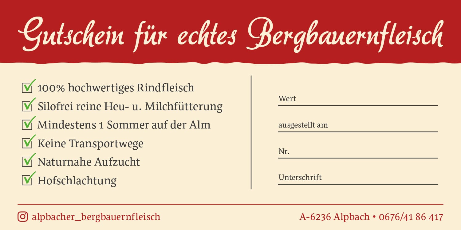 Mit einem Wertgutschein vom Alpbacher Bergbauernfleisch machst Du alles richtig. Und wer weiß, vielleicht wirst Du dann ja vom Beschenkten mal zum Essen eingeladen 😉